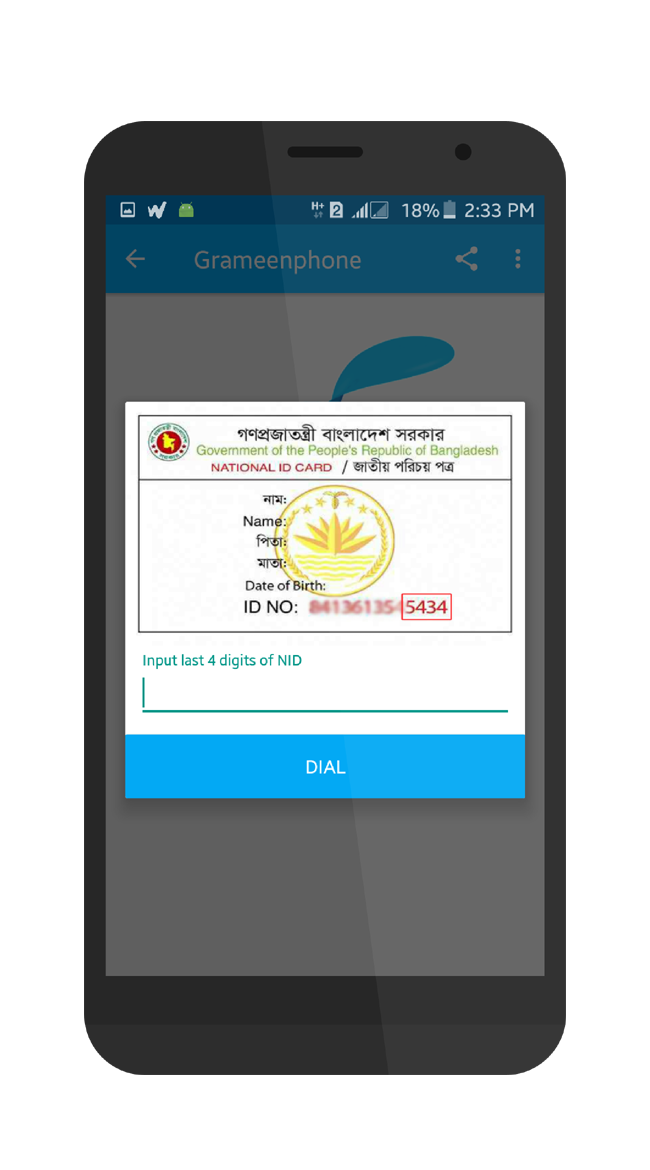 ধরে নিলাম, আপনি আপনার গ্রামীনফোনের সিমটি যাচাই করেছেন এবং সেখানের "SIM VERIFY (FREE)" বাটুনে কিল্ক করুন। তাহলে আপনার সামনে নিচের ছবির মত স্ক্রীন দেখা যাবে যেখানে সংখ্যা প্রবেশের জায়গায় আপনার এন.আই.ডির (জাতীয় পরিচয়পত্রের) শেষ চার ডিজিট দিয়ে "DAIL" বাটুনে কিল্ক করুন।