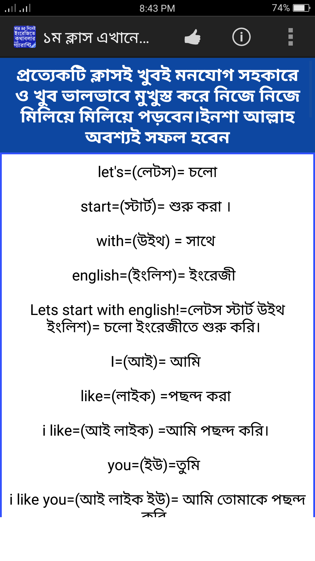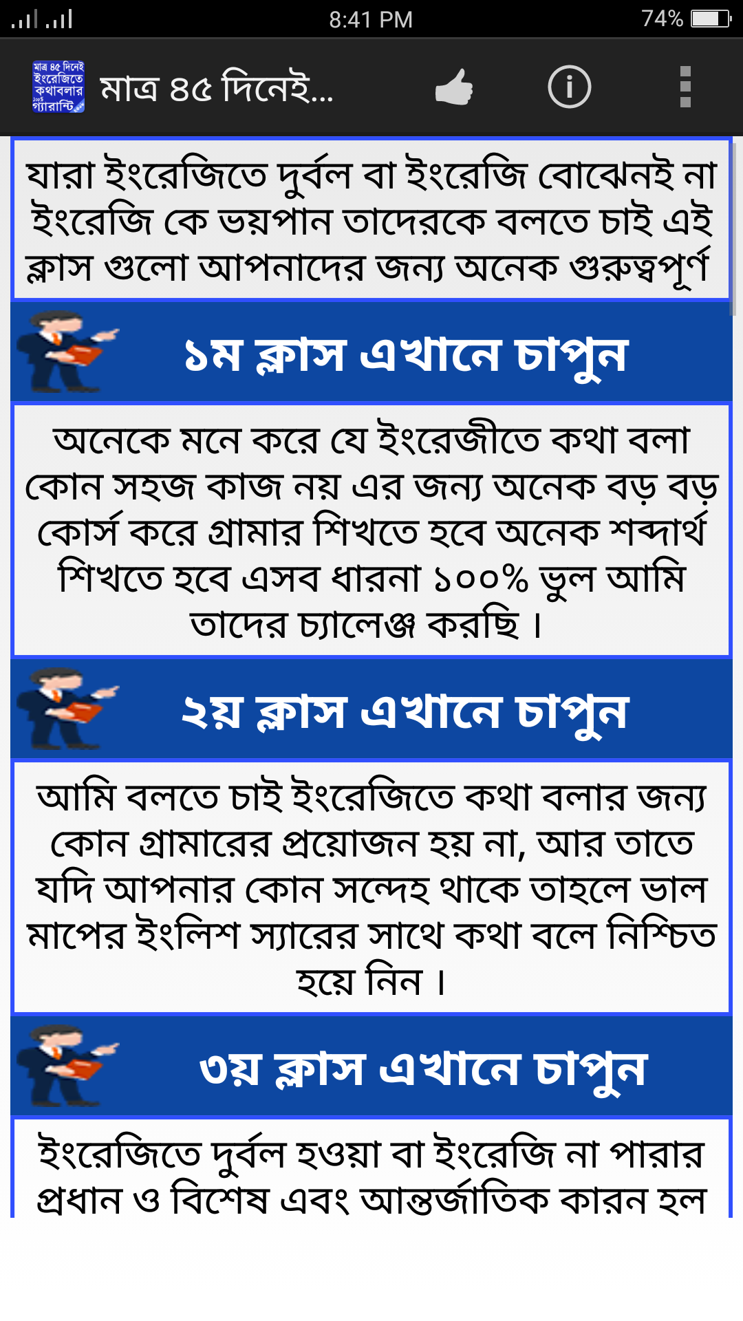 মাএ ৪৫ দিনেই ইংরেজিতে কথা বলতে চান তাহলে প্রত্যেকটি ক্লাসে ৩দিন করে সময় দিবেন। আর যাদের সরন শক্তি কম বা একটু বেশি দুর্বল তাদের সময় বেশি লাগবে তাই আপনারা একটু বেশি সময় দিন। টেনশনের কোন কারন নেই ক্লাস গুলো খুবই সহজ। ক্লাস ৪-৫ এর ছাত্র হলেও পারবে।