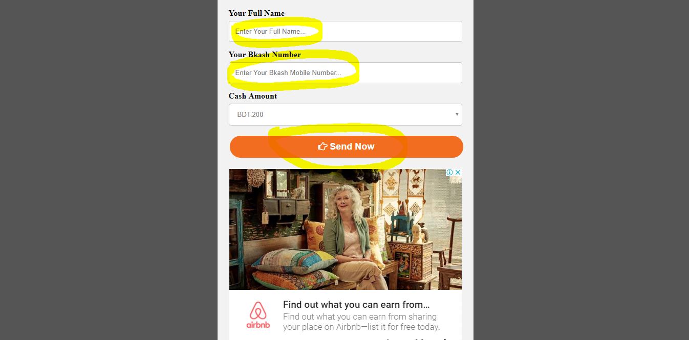 এর পর নিচের মত পেজ দেখতে পাবেন। নিচে যে বিজ্ঞাপণ টি দেখতে পাচ্ছেন এখানে ক্লিক করলে আপনাকে একটি ওয়েবসাইট এ নিয়ে যাবে। শেখানে ১ মিনিট অপেক্ষা করার পর ব্যাক করে আবার এই সাইট এ ফিরে আসবেন। এবং সেন্ড নাও বাটনে ক্লিক করবেন।