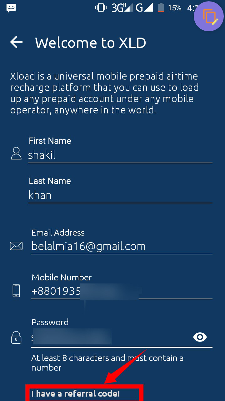৩, screenshoT অনুযায়ী form পূরন করুন। এখানে আপনাকে gmail ও number verify করতে হবে এবং চিহ্নিত স্থানে রেফার কোড দিতে হবে।