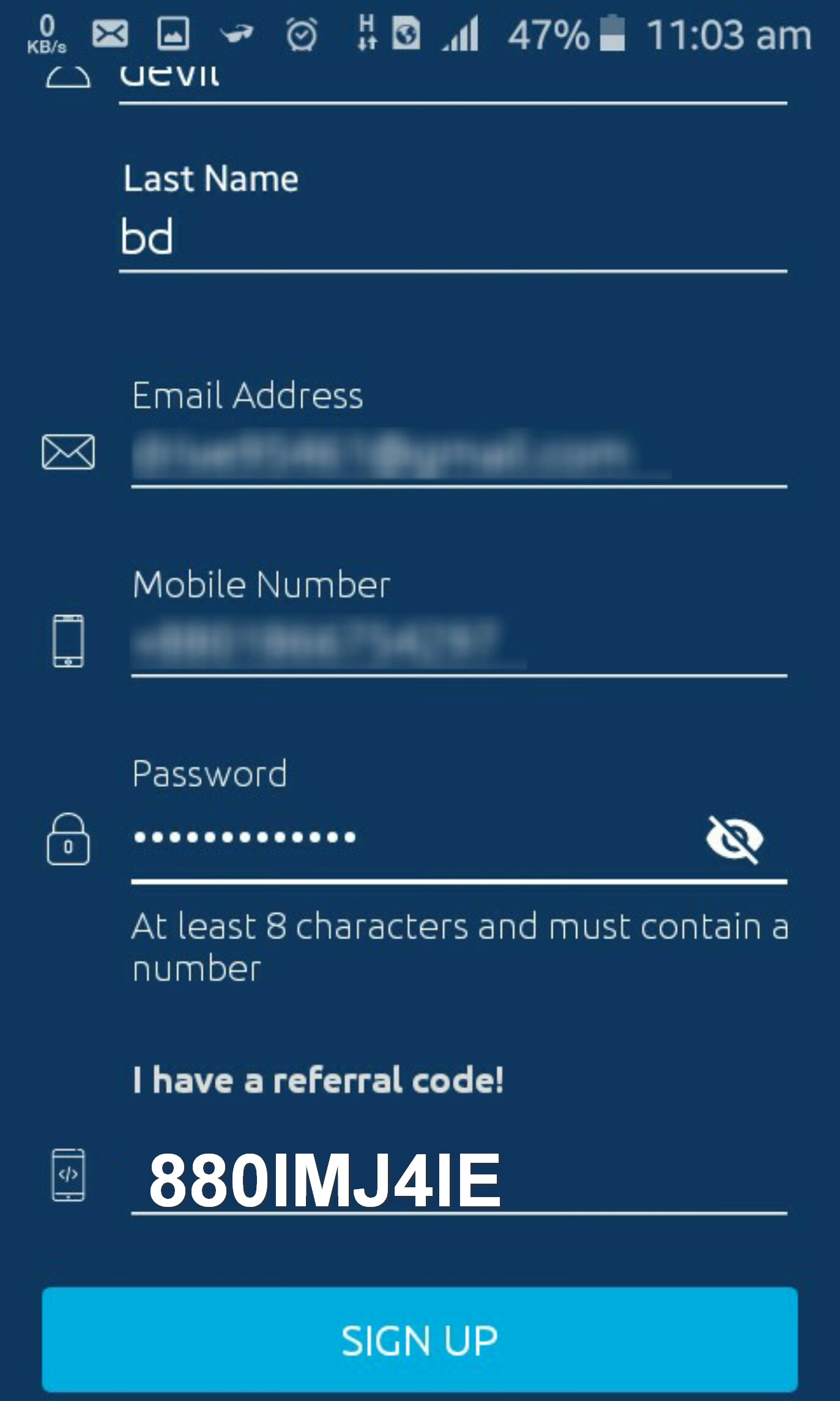 তারপর নিচের মতো একটি পেইজ আসবে সেখানে আপনার নাম, মোবাইল নাম্বার, ইমেইল এড্রেস, দিয়ে ভেরিফিকেশন করুন ও এর নিচে দেখতে পাবেন I have a referral code! লেখা আছে সেখানে ক্লিক করে 880IMJ4IE এই কোডটি দিন নিচের স্ক্রিনশট এর মতো