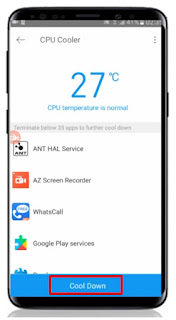 আপনার মোবাইল যখন খুব গরম হয়ে যায় তখন এটি দারুন কাজ করে, CPUCooler এর মাধ্যমে আপনি আপনার মোবাইলকে ঠাণ্ডা করে নিতে পারেন। এজন্য আপনাকে CUP Cooler লেখাটিতে ক্লিক করতে হবে তাহলে এটি নিচের চিত্রের মত স্ক্যান হতে থাকবে এবং স্ক্যান হয়ে গেলে Cool Down লেখা চলে আসবে এখন আপনি Cool Down লেখাটিতে ক্লিক করুন। তাহলে আপনার মোবাইলের তাপমাত্রা কমে যাবে।