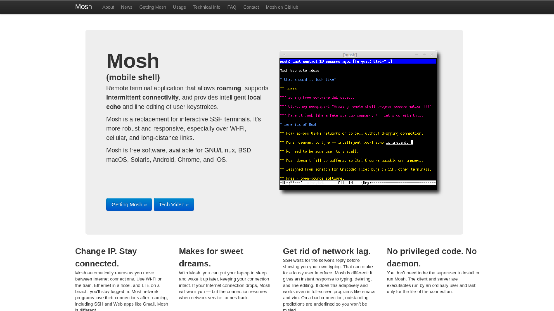 Mosh একটি VPS কানেক্ট ক্লায়েন্ট যা সাধারণত SSH ব্যবহার না করে UDP ব্যবহার করে এবং যা শুধু মাত্র ফোনের জন্যই বানানো। গতানুগতিক SSH যা করে সেটা হচ্ছে সার্ভারের রেসপন্স এর জন্য অনেক বেশি সময় অপেক্ষা করে।