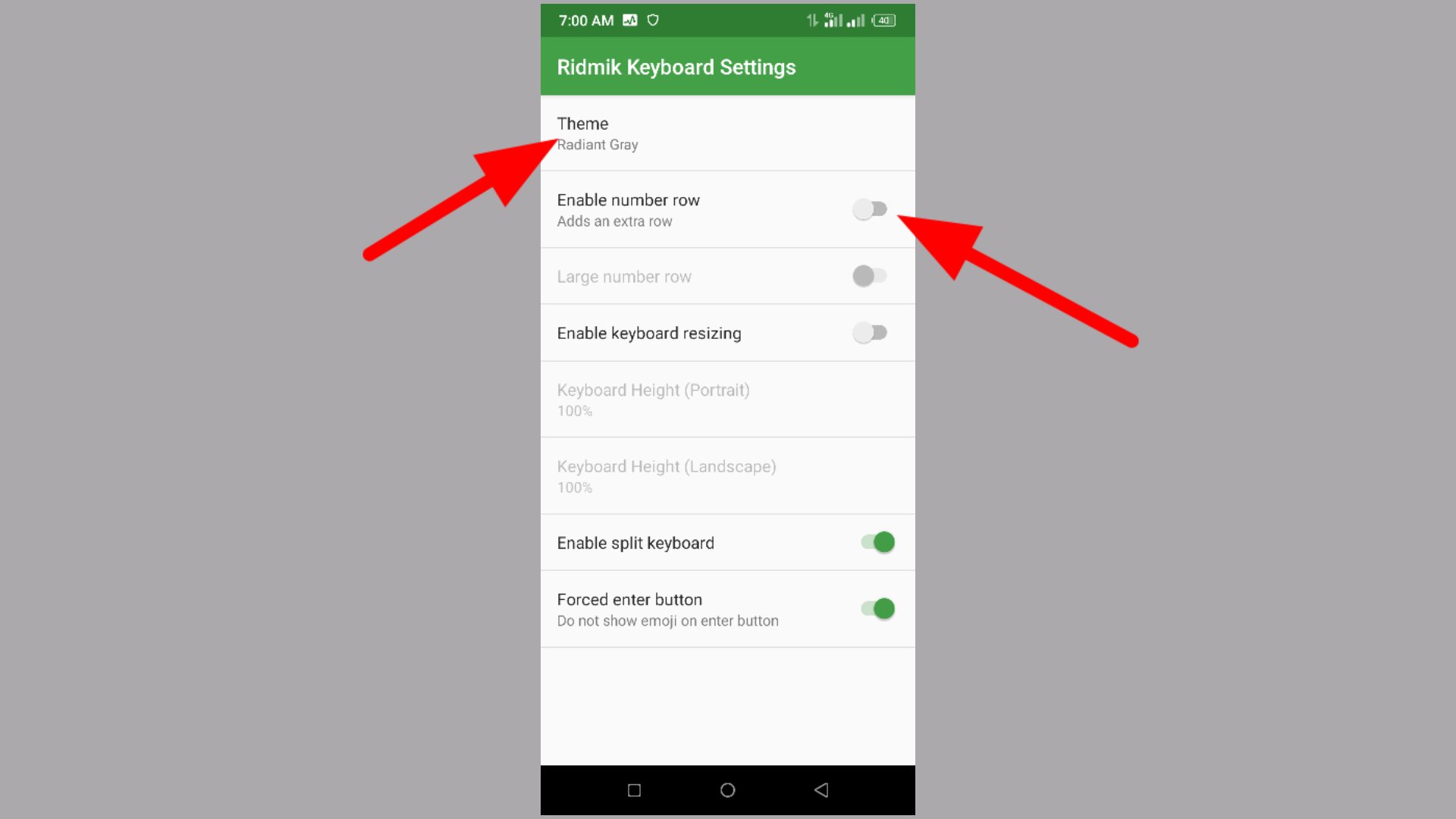 ৯. তারপর আপনি নিচের মতো দেখতে পাবেন > উপরে Theme এবং তার নিচে Enable number row। আপনি যদি কিবোর্ডের উপরের নাম্বারের সারি যুক্ত করতে চান, তবে আপনি নিচের সেটিংটি চালু করে দিতে পারেন। অর্থাৎ কিবোর্ডের উপরে ১, ২, ৩, ৪, ৫. সংখ্যাগুলো প্রদর্শন করবে। যার ফলে আপনি খুব তারাতারি কোনো সংখ্যা তুলতে পারবেন। তবে এটি চালু করে দিলে আপনার কিবোর্ডটি কিছুটা বেশি জায়গা দখল করে নেবে, যা আপনার জন্য অসুবিধারও হতে পারে। আপনি এটি চালু করবেন কিনা সেটা আপনার ব্যপার।