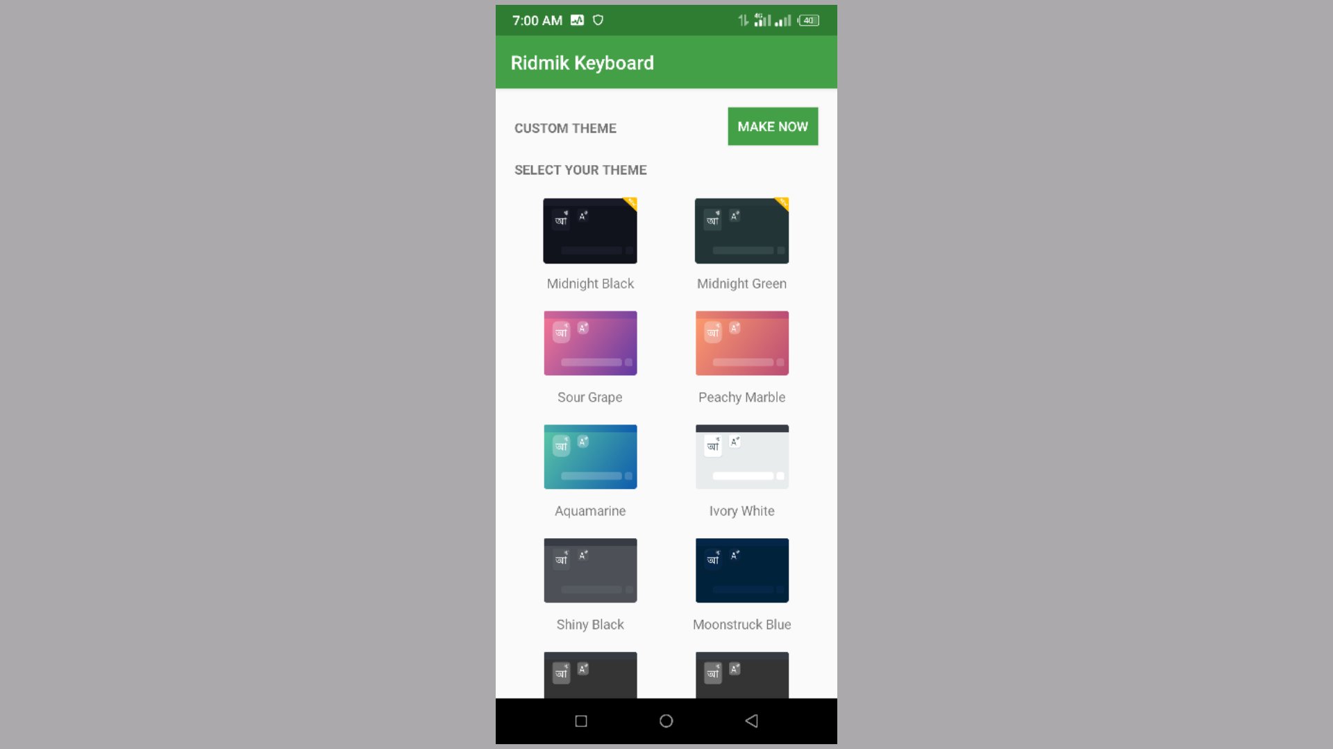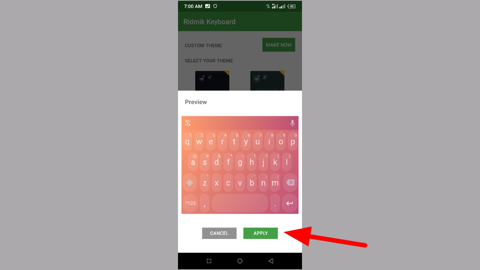 ১০. এরপর আপনি যদি কিবোর্ডের Theme বদলাতে চান তাহলে আপনি উপরের Theme এ ক্লিক করুন। তারপর আপনি নিচের মতো কিছু Theme দেখতে পারবেন। আপনার যে Theme টি পছন্দ হয় সেটির উপর ক্লিক করুন। তারপর Apply এ ক্লিক করুন। তাহলেই সে Theme টি আপনার কিবোর্ডে সেট হয়ে যাবে।