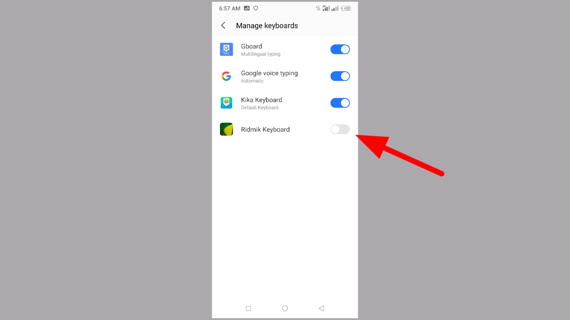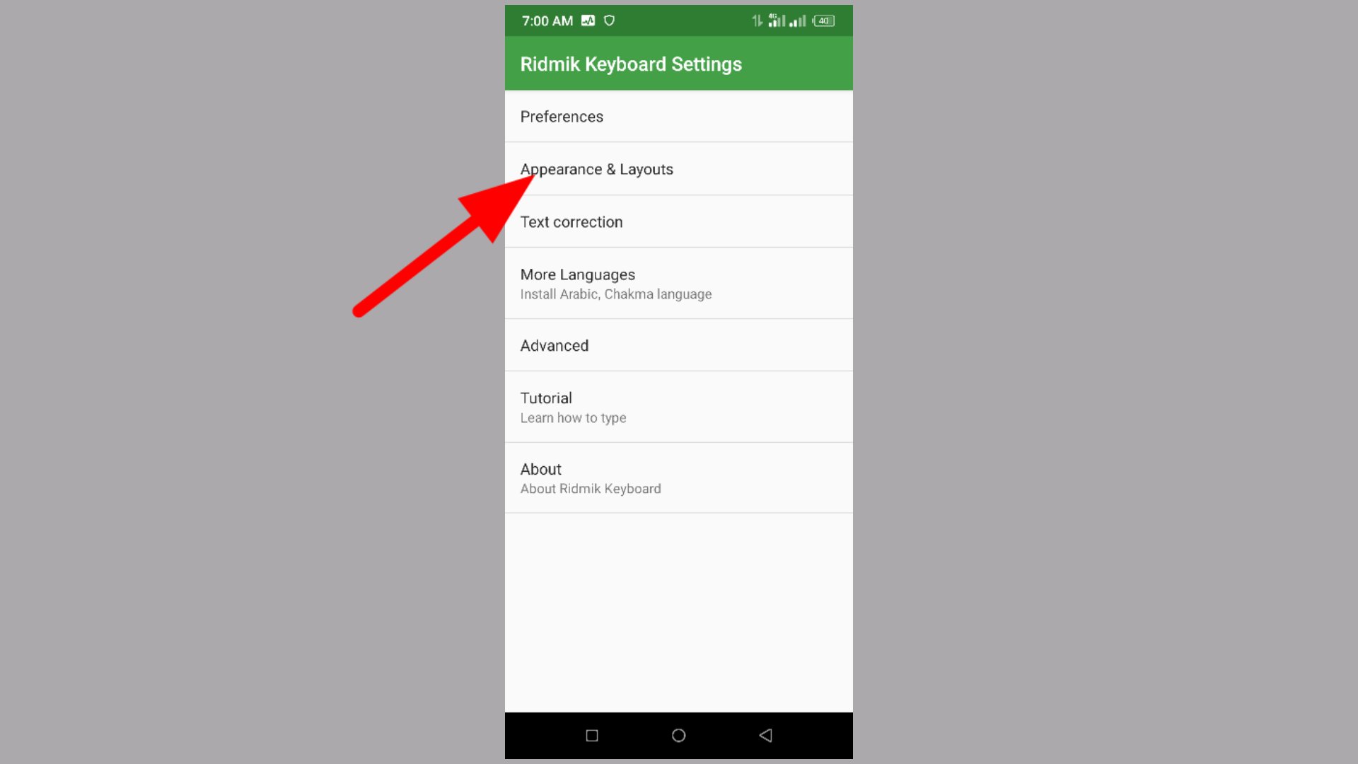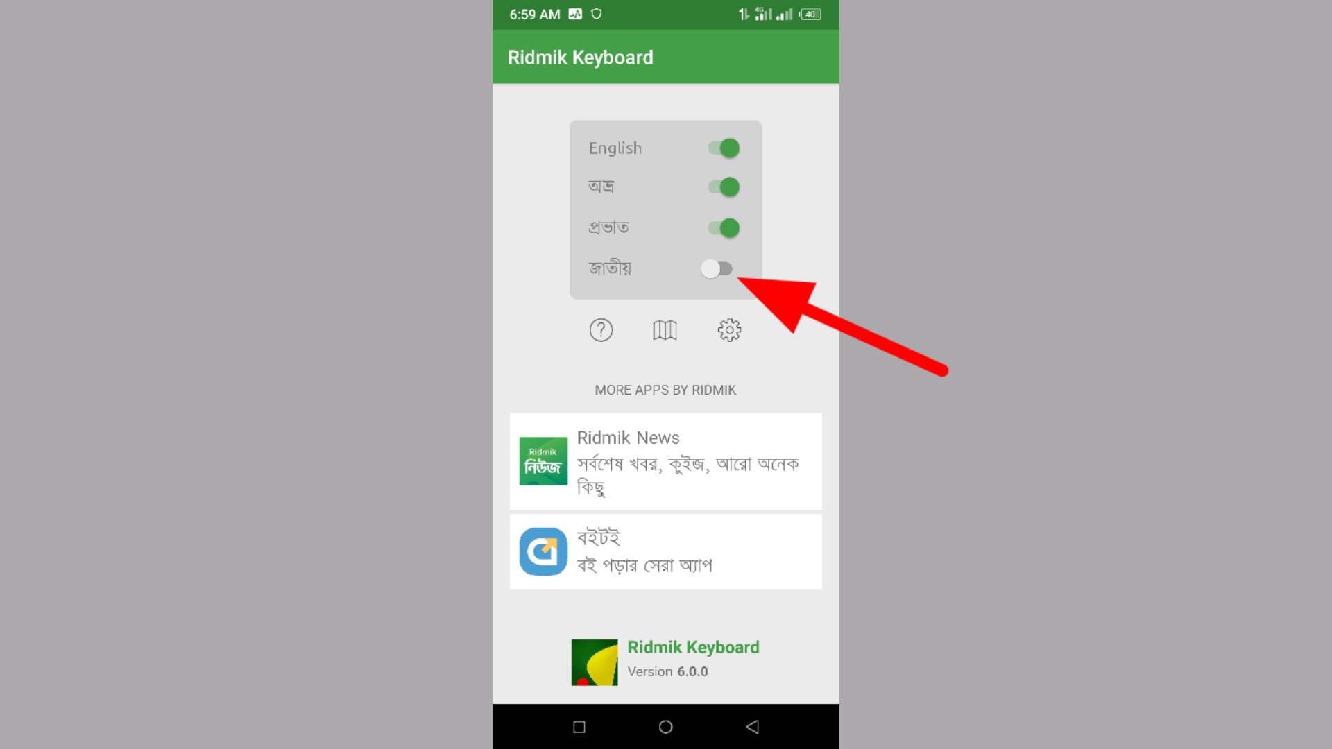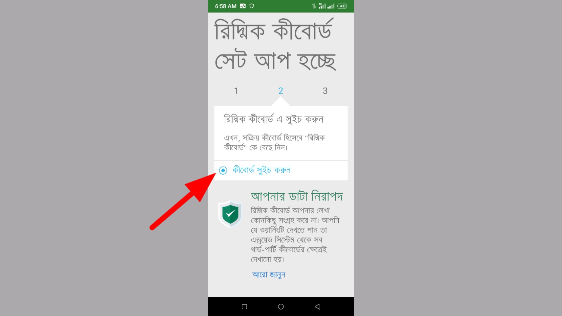৪. এরপর আপনি পিছনে চলে আসুন। তারপর দেখতে পাবেন, >কিবোর্ড সুইচ করুন< আপনি এখানে ট্যাপ করুন। তারপর আপনি এখান থেকে Ridmik Keybord সিলেক্ট করে দিন।
