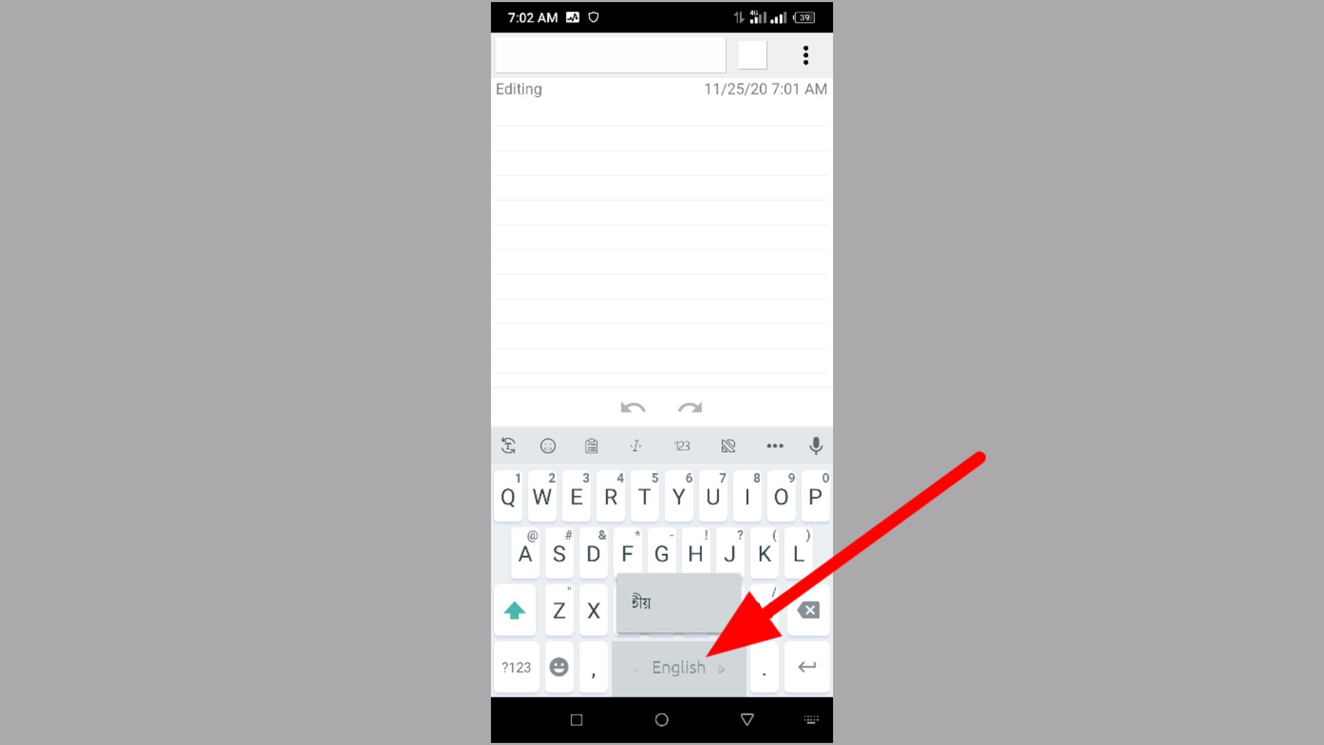 ১১. এরপর আপনি কোন কিছু লিখতে চলে যান, এখন আপনি ভাষা পরিবর্তনের জন্য নিচের Space বাটনটিতে Swipe করুন। তাহলেই বাংলা থেকে ইংরেজি হবে, অথবা ইংরেজি থেকে বাংলা হবে।
