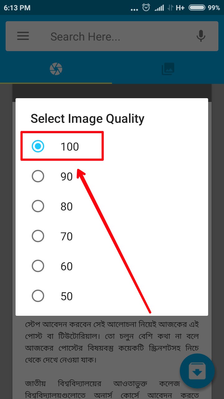 ইমেজ বা পিডিএফ ফাইলের কোয়ালিটি ঠিক রাখতে আপনাকে অ্যাপটির সেটিংসে গিয়ে কোয়ালিটি সেট করতে হবে। তাহলে আপনার ইমেজ বা পিডিএফটি ভালোমানের হবে। তো এর জন্য আপনাকে উপরের স্ক্রিনশটের মত মেনুবারে ক্লিক করতে হবে।