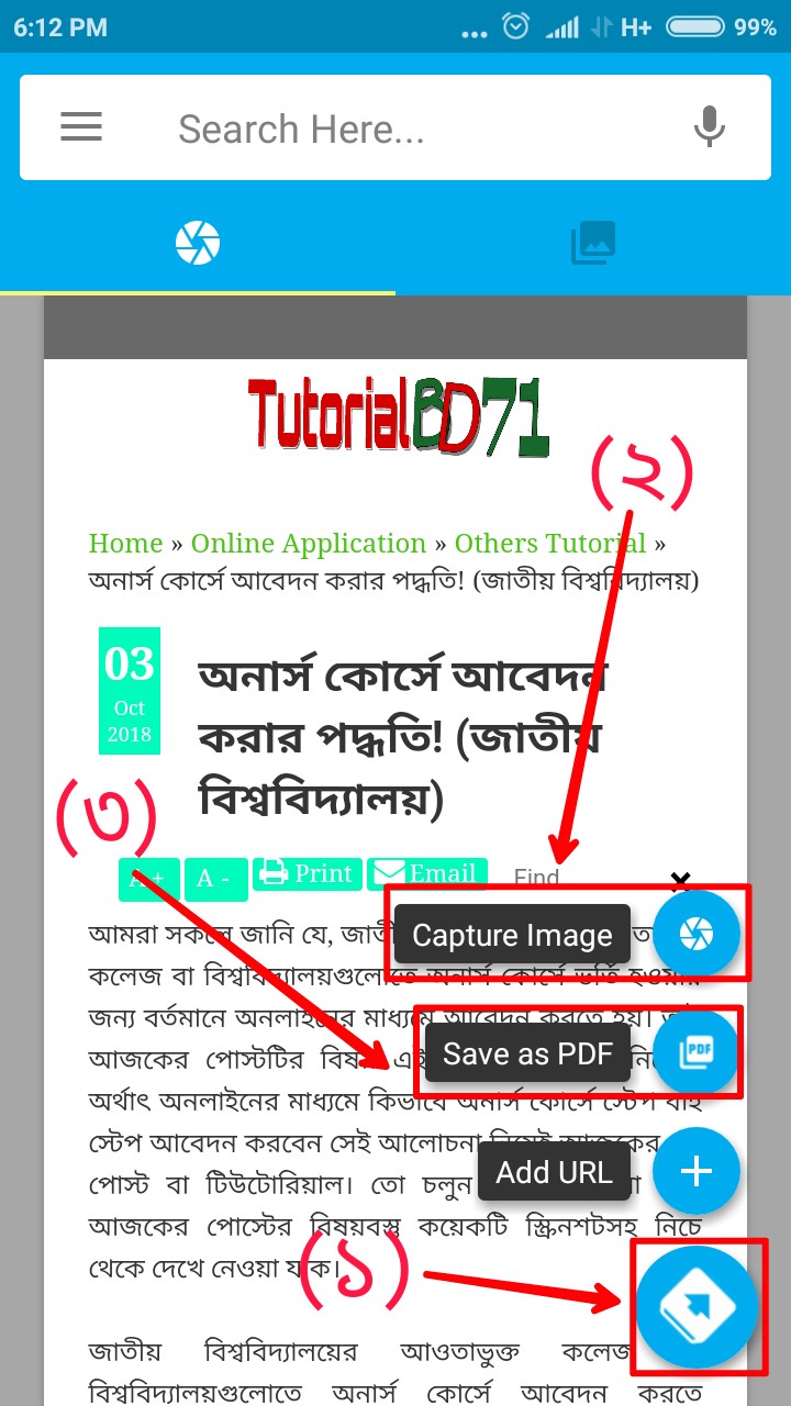 আপনি যে ওয়েবসাইটের টিউটোরিয়াল পেজ সেভ করতে চান সেটির লিংক আগে কপি করে নিন। যেমন আমি এই https://tutorialbd71.blogspot.com/2018/10/national-university-honours-application-process.html লিংকটি কপি করে নিলাম। তারপর অ্যাপটি অপেন করে উপরের স্ক্রিনশটের মত (১) ডাউনলোড আইকনে ক্লিক করে (২) Add Url এ ক্লিক করুন।