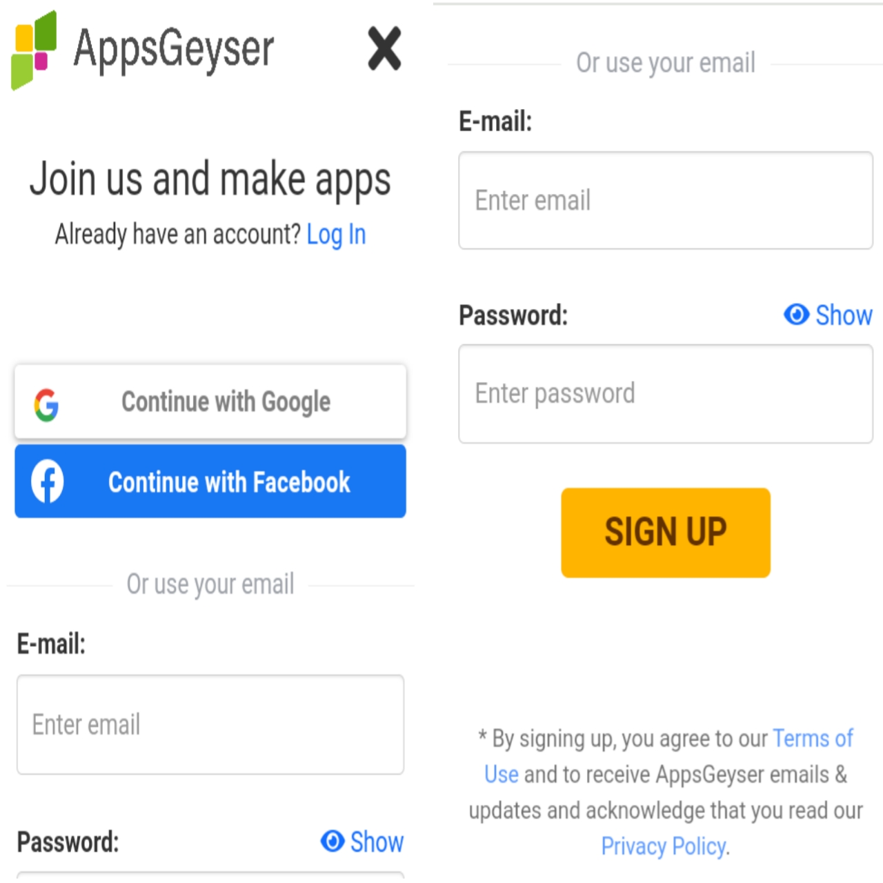 এখানে অ্যাপস তৈরি করার আগে আপনাকে appsgeyser.com এ একটি অ্যাকাউন্ট তৈরি করতে হবে। এখানে আপনি আপনার ফেসবুক বা গুগল অ্যাকাউন্ট দিয়ে লগইন করতে পারবেন।