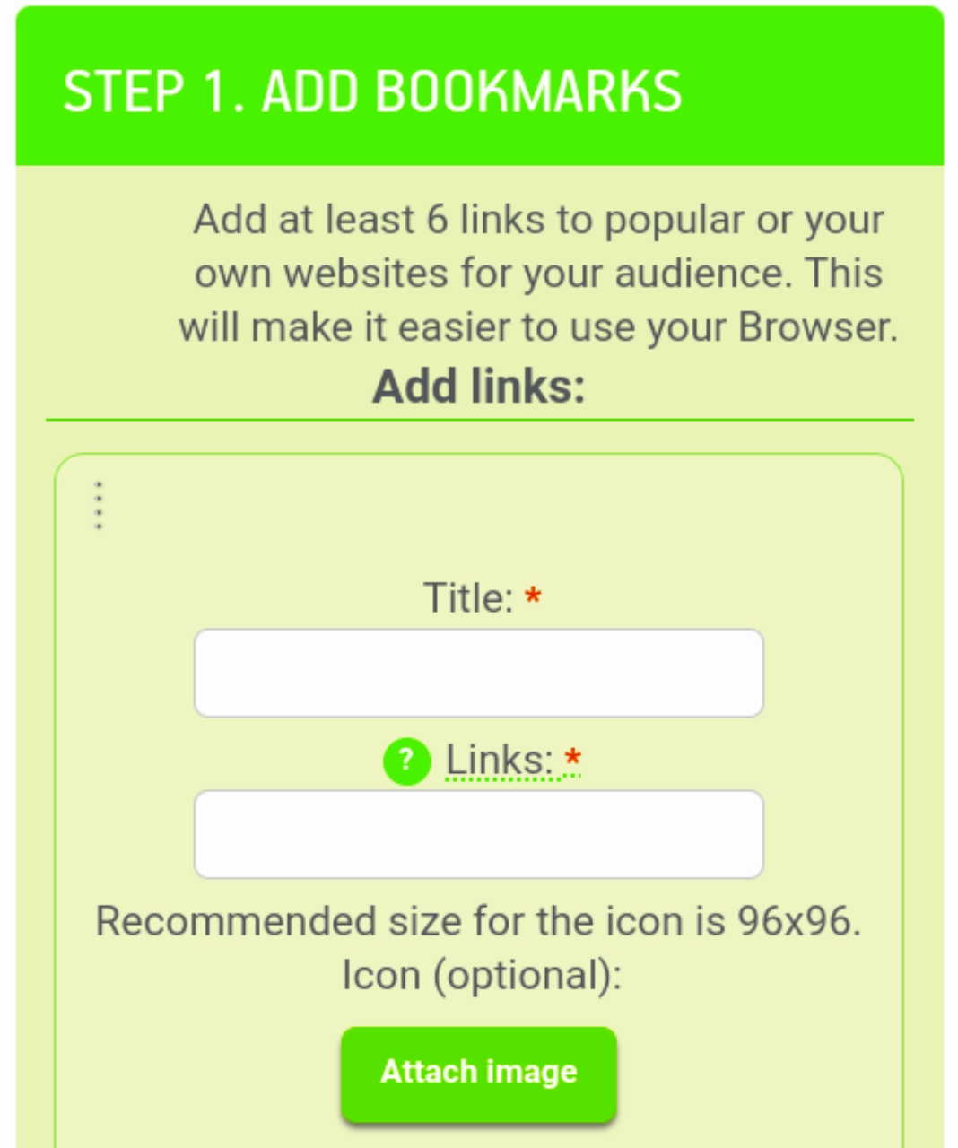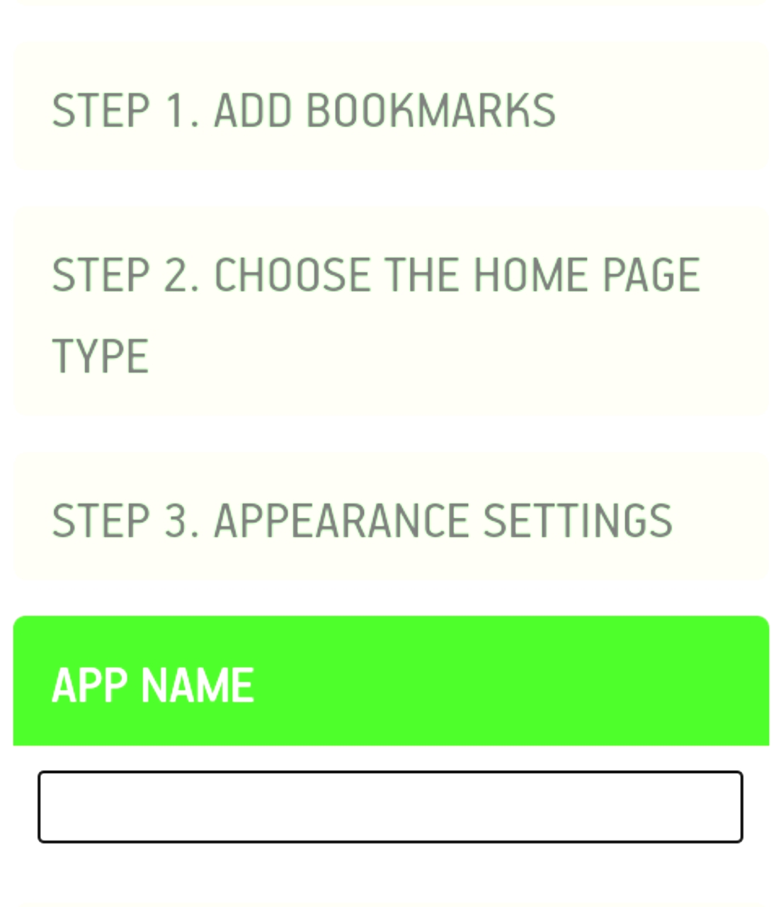 একটি ব্রাউজার অ্যাপস তৈরি করার জন্য সর্বপ্রথম আপনাকে যা করতে হবে। সেটি হল অ্যাপস এর মধ্যে একটি বুকমার্ক তৈরি করা। অর্থাৎ এখানে কয়েকটি ওয়েবসাইটের নাম এবং লিংক যোগ করতে হবে। এখানে সর্বনিম্ন ৬ টি ওয়েবসাইটের নাম ও লিংক দিতে হবে।