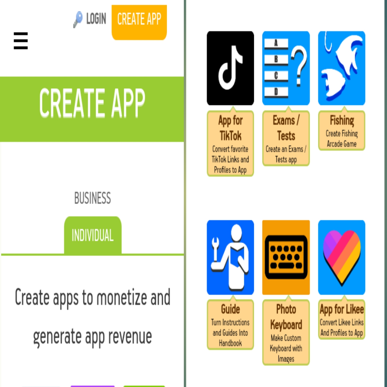 অ্যাকাউন্টে লগইন করার পর আপনাকে ড্যাসবোর্ডে নিয়ে যাবে। ড্যাশবোর্ডে গিয়ে আপনাকে বাছাই করতে হবে, আপনি কোন ধরনের অ্যাপস বানাবেন। এখানে আপনি individual এবং business এই ২ ধরনের অ্যাপস তৈরি করতে পারবেন। Individual অ্যাপস এর মধ্যে রয়েছে ব্রাউজার, ফটো-এডিটর, টিক-টক, লাইকি ইত্যাদি অ্যাপস।