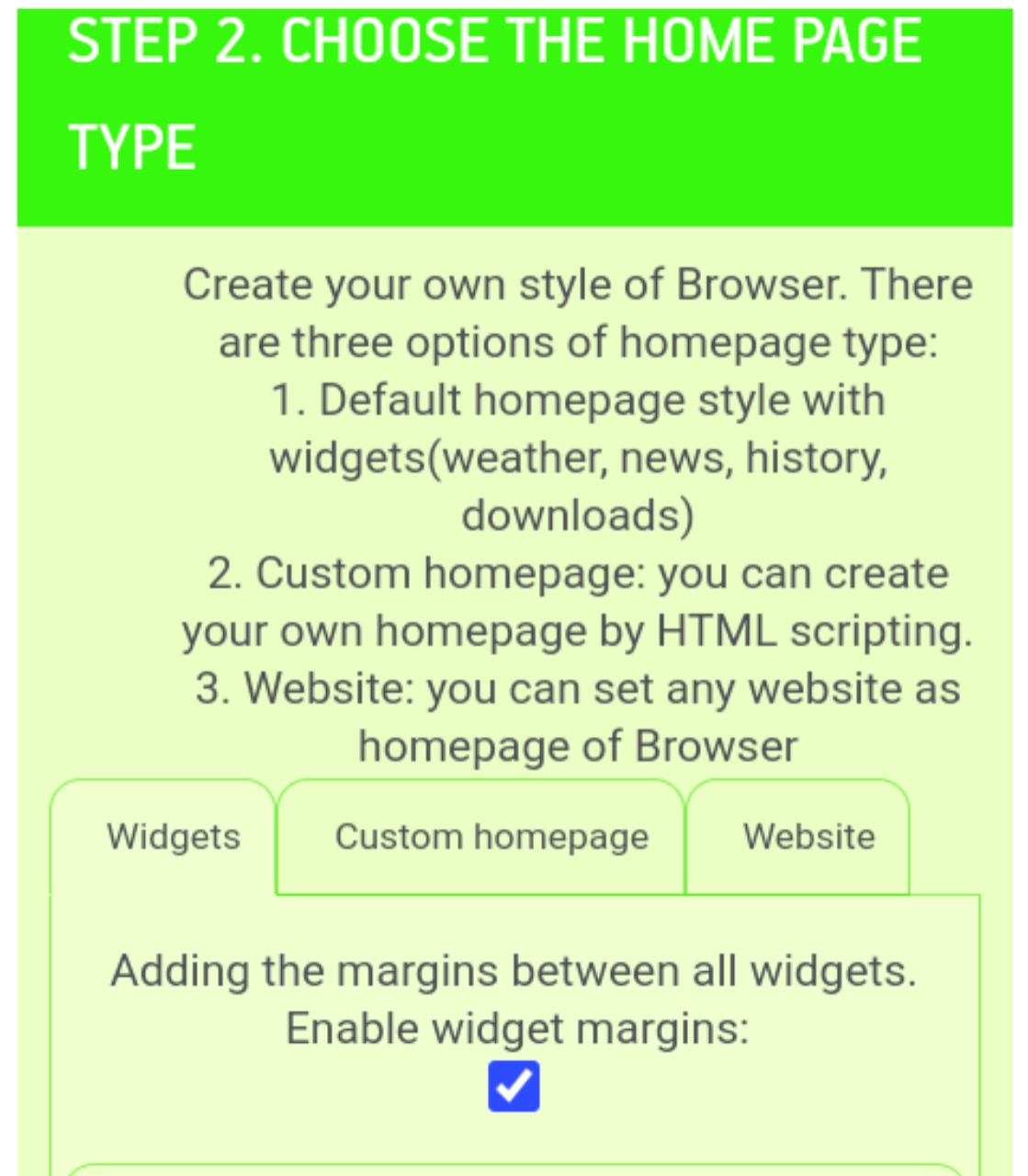 এছাড়া আপনি চাইলে নিজে হোমপেজ তৈরি করে লাগাতে পারেন। এটি আপনাকে HTML স্ক্রিপ্ট আকারে তৈরি করতে হবে। আপনি চাইলে যে কোন ওয়েবসাইটকে হোমপেজ হিসেবে রাখতে পারেন। যেমন গুগল এর হোমপেজকে আপনার অ্যাপস এর হোমপেজ হিসেবে রাখতে পারেন।