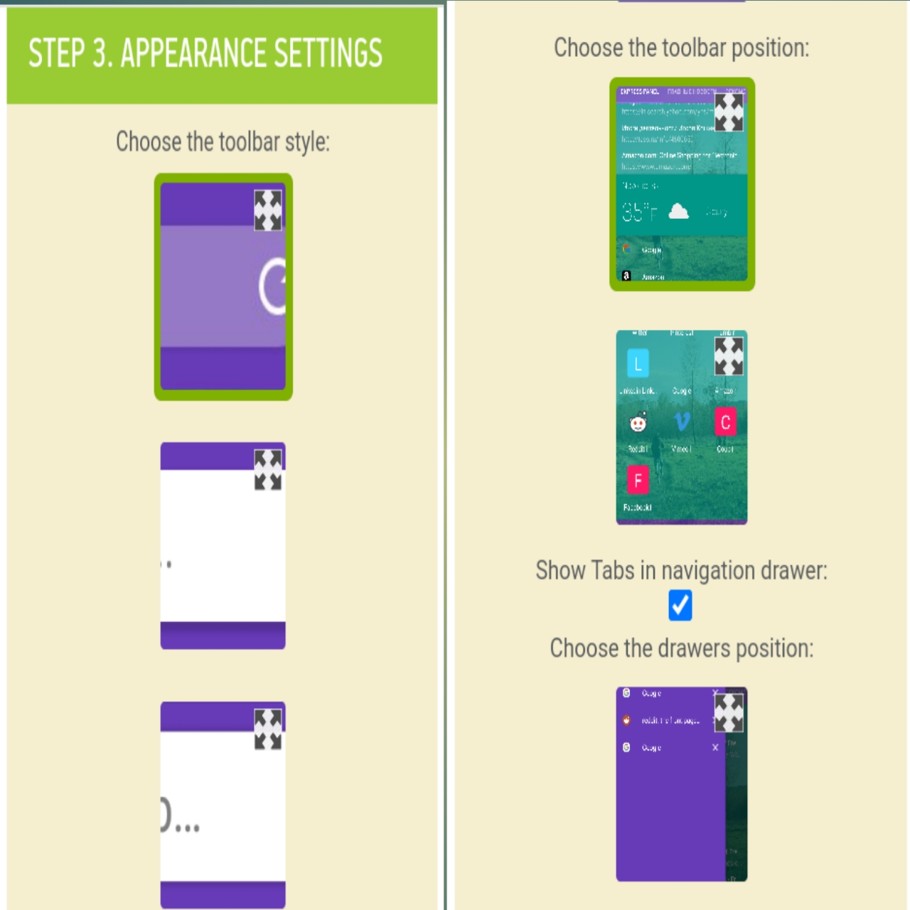 আপনার অ্যাপসের হোমপেজে টুলবারগুলো কিরকম ভাবে রাখতে চান তা সেট করতে হবে। অর্থাৎ আপনি বুকমার্ক তৈরি করার সময় যেসব ওয়েবসাইটের লিংক যোগ করেছিলেন।