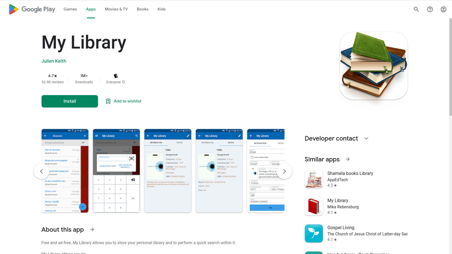 My Library একটি চমৎকার সিম্পল অ্যাপ যার সহজ ইন্টারফেসের মাধ্যমে খুব দ্রুত বারকোড বা ISBN এর মাধ্যমে বই লাইব্রেরীতে এড করে নিতে পারবেন। রয়েছে ম্যানুয়ালি এড করার ব্যবস্থাও। ভবিষ্যতে যে বই পড়তে আপনি আগ্রহী সেটা অ্যাপ এর Wish list এড করে নিতে পারবেন। এই অ্যাপ এর মাধ্যমে আপনি চাইলে কমিক এবং ভিডিও গেমও ট্র্যাক করতে পারবেন।