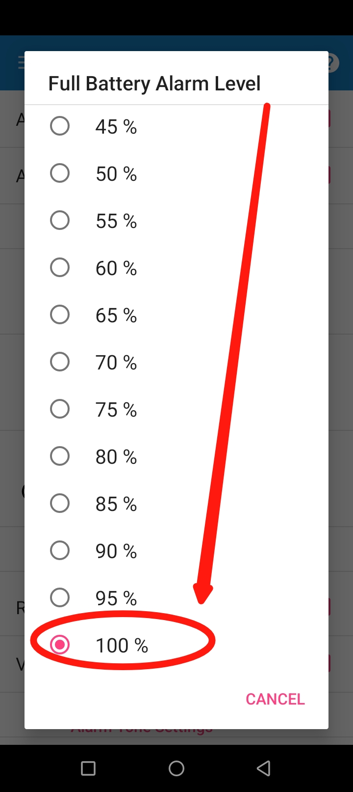 এখানে আপনি আপনার ফোন এ কত শতাংশ চার্জ পূরণ হলে অ্যালার্ম বাজবে সেটা সেট করতে পারবেন।