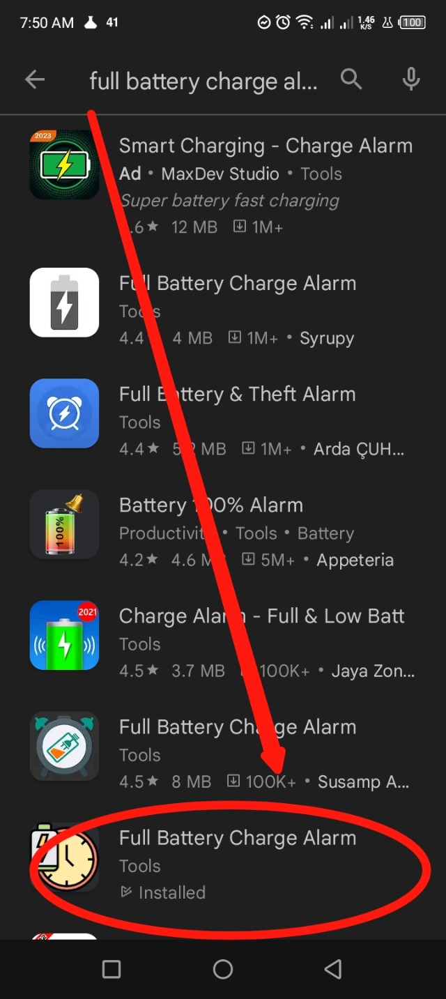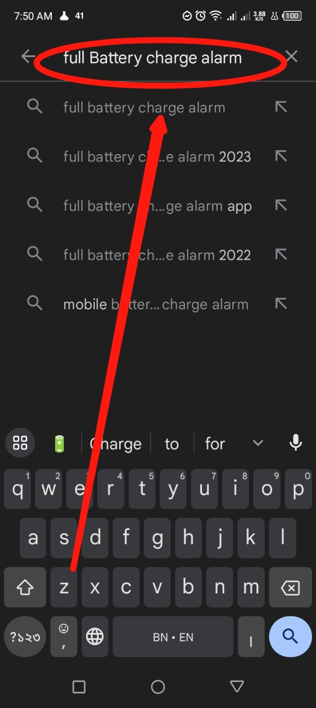 অ্যাপসটি ডাউনলোড করার জন্য প্রথমে আপনাকে প্লে স্টোরে যেতে হবে। এরপর সার্চ অপশনে যেয়ে Full Battery Charge Alarm সার্চ করতে হবে।