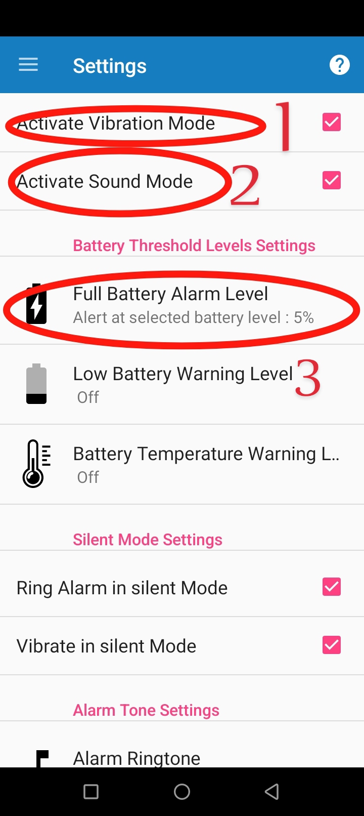 এখানে দেখুন সেটিংস এ আপনার ফুল চার্জের অ্যালার্ম সেট করার জন্য সমস্ত রকমের অপশন আছে। কোনো প্রকার অপশন মিস নেই। নাম্বার 1 এ আপনি আপনার ফোনে ফুল চার্জ হলে ভাইব্রেশন হবে নাকি সেটা সেট করতে পারবেন। নাম্বার 2 এ আপনার ফোন ফুল চার্জ হলে রিং বাজবে কি না সেটা ঠিক করতে পারবেন। আপনি এখন 3 নাম্বার অপশন এ ক্লিক করুন।
