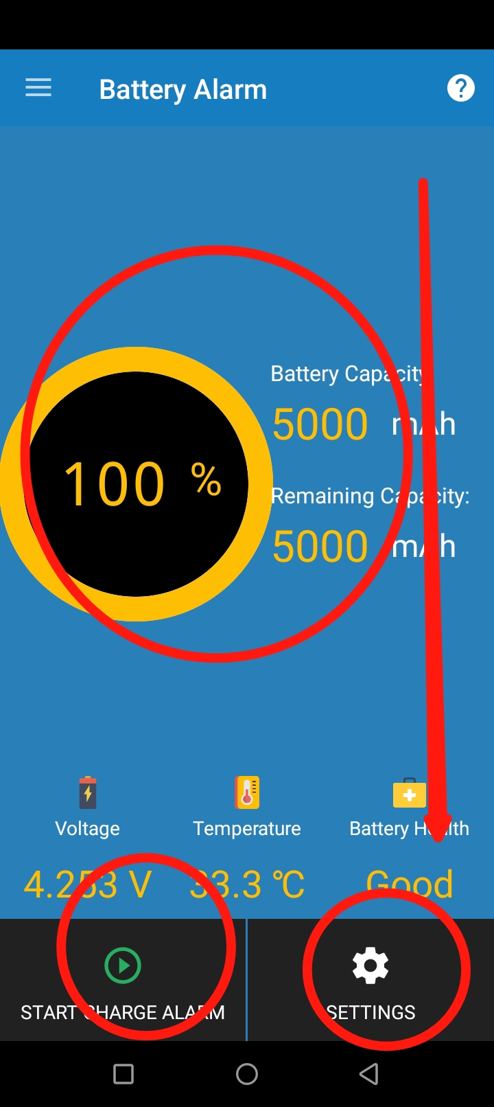 দেখুন এখানে আমার ব্যাটারী এবং চার্জ এর পরিমাণ দেখাচ্ছে। এবং আরো দেখুন নিচে Start Charge Alarm লেখা আছে। এটা এখন কাজ করবে না। এটাকে কাজ করানোর জন্যে প্রথমে Settings এ ক্লিক করুন।