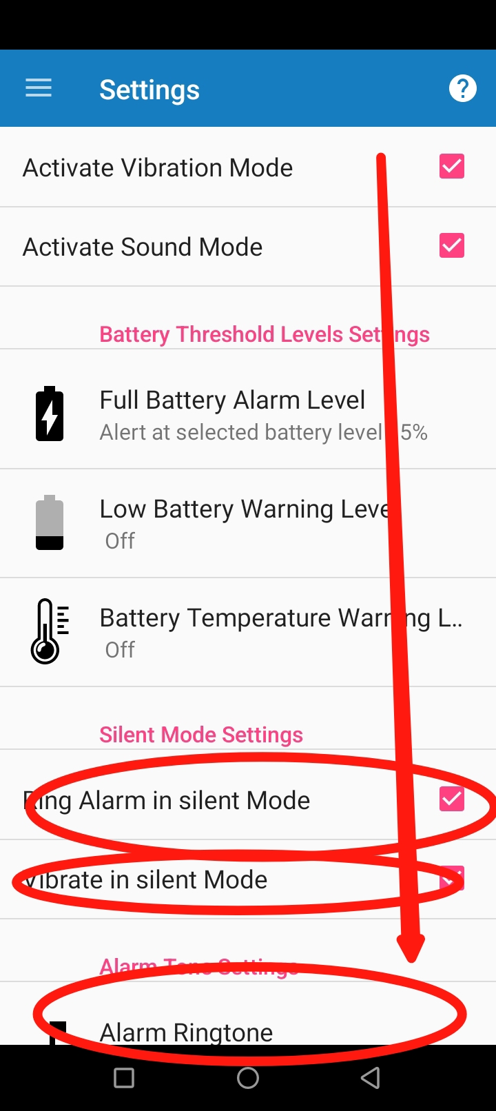 নিচের ছবিতে প্রথম দুটি অপশনে সাইলেন্ট মোড এ রিং হবে কি না ভাইব্রেশন হবে কি না সেগুলো সিলেক্ট করুন। এরপর নিচের Alarm Ringtone এ ক্লিক করুন।