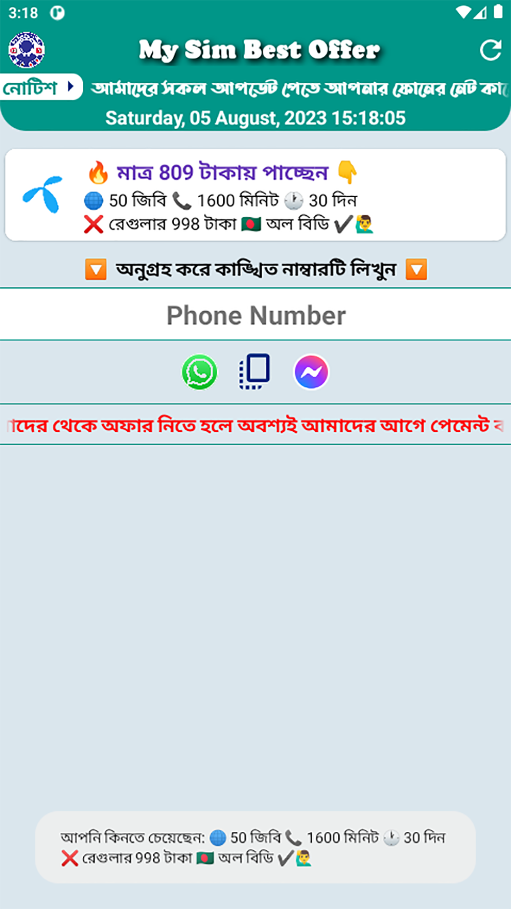 প্রথমে আপনি যে সীমের অফার নিবেন এবং যে অফার টি আপনার পছন্দ হবে তার উপর টাচ করলে আপনার নাম্বার লিখতে বলবে, এর পর এডমিন এর WhatsApp & Facebook মেসেজ দিতে পারবেন। এর পর এডমিন আপনাকে রিচার্জ করে দিবে।