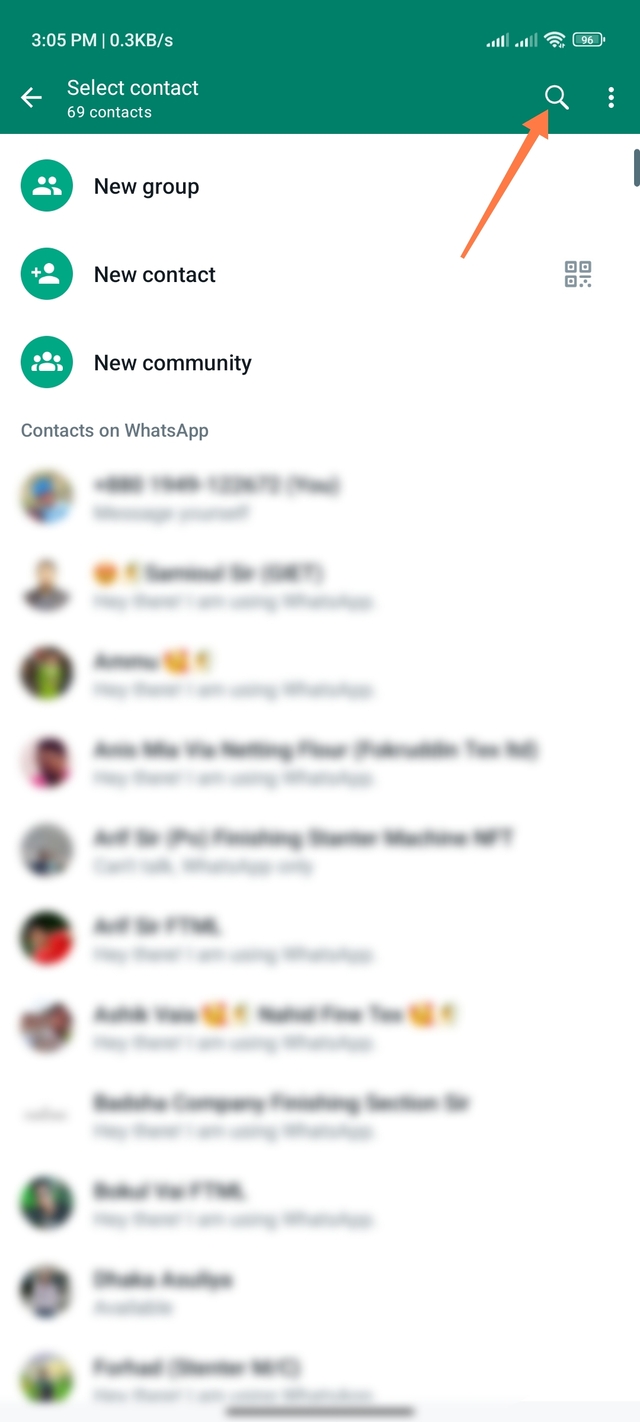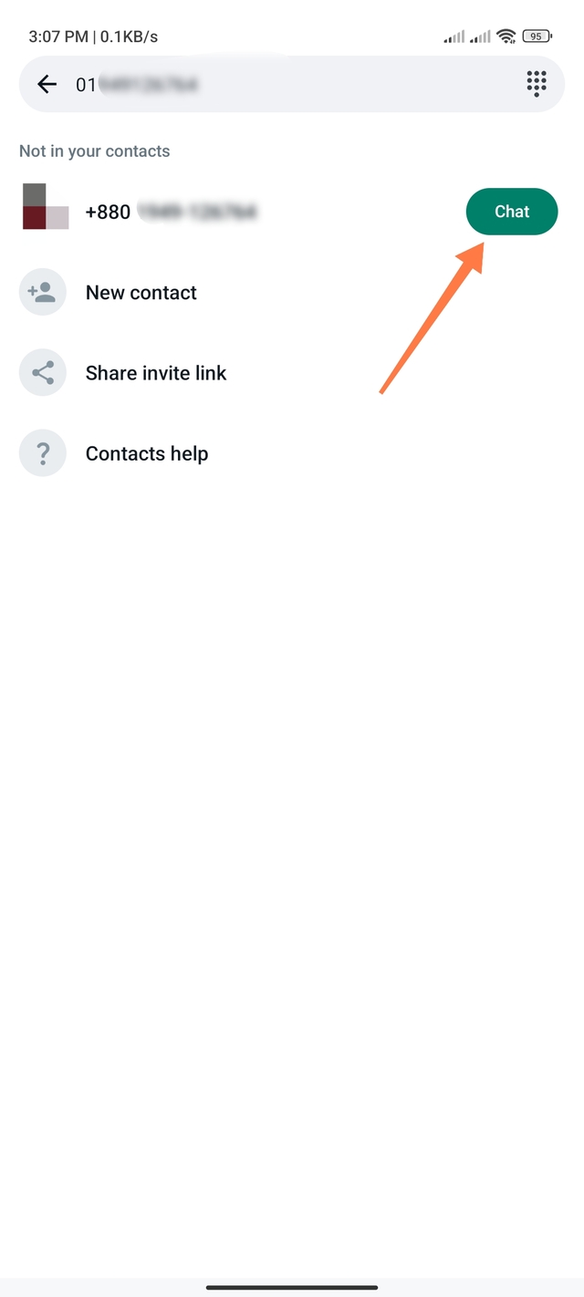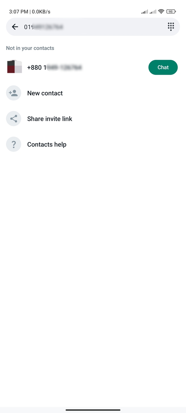 ৫. তারপর আপনারা যে নম্বরটি Whatapp সেভ না করেই মেসেজ করতে চাচ্ছেন সেই নম্বরটি সার্চ বক্সে লিখে ফেলুন। নাম্বার টি সার্চ বক্সে লেখার পর কিছুক্ষণ অপেক্ষা করুন। দেখুন সার্চ দেওয়া নাম্বারটিতে থাকা Whatsapp অ্যাকাউন্ট শো করছে।