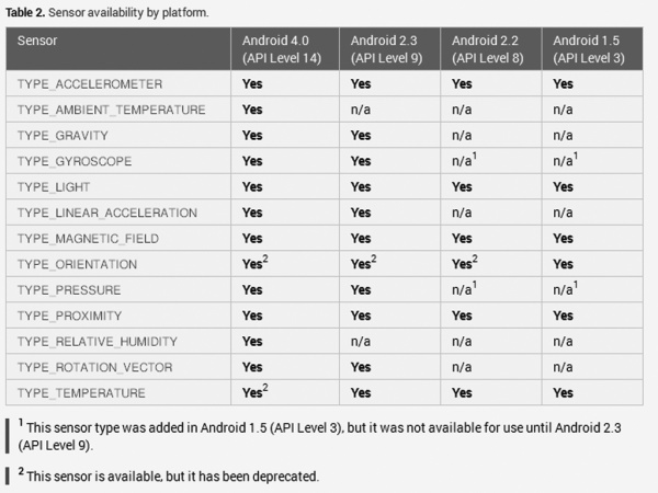 উপরে উল্লেখিত প্রতিটি সেন্সর এন্ড্রয়েডের এর বিভিন্ন সংস্করন অনুযায়ী উপলব্ধ হয়। নিম্নের চিত্রে প্রদর্শিত ছকে বিস্তারিত দেখুন।