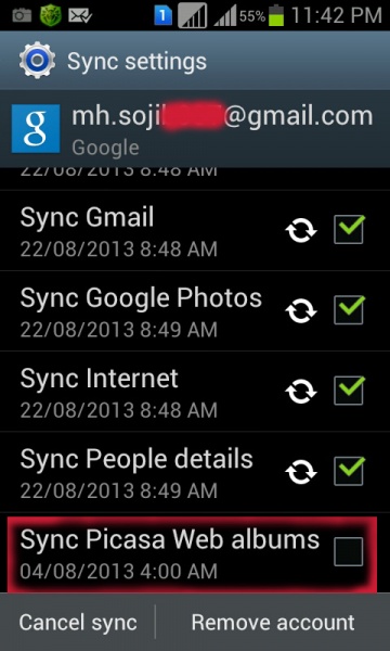 ৩. জিমেইল অ্যাকাউন্টে ঢুকার পর সবার নিচে দেখবেন একটা লেখা আছে ' Sync Picasa Web album' এটাকে আনমার্ক করুন (উপরের চিত্রের মত) ( বিঃদ্রঃ ২ নং ধাপটি না করলে আপনি টিক/আনটিক করার অপশন পাবেন না) ।