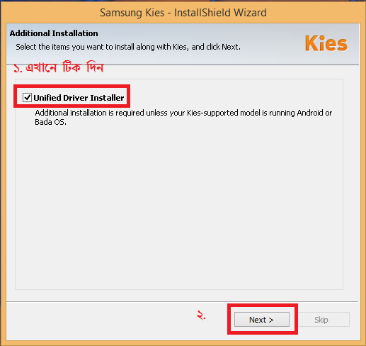 এবার Samsung Kies ইন্সটল করুন । নিচের মত আসলে Unified Driver Installer এ ক্লিক করতে ভুলবেন না ।
