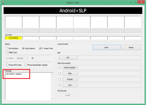 এবার Odin3 v1.85.exe ফাইলটি Administrator Moode run করান ও Data Cable দিয়ে ট্যাবটি পিসির সাথে connect করুন । Connection ঠিক ভাবে হলে নিচের মত দেখাবে এবং মেসেজ বক্সে Added!! দেখাবে