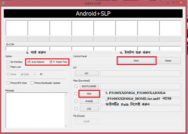 ১. PDA ট্যাবে ক্লিক করুন ও CF-Auto-Root-espressorf-espressorfxx-gtp3100.tar.md5 নামের ফাইলটির Path সিলেক্ট করুন ।
