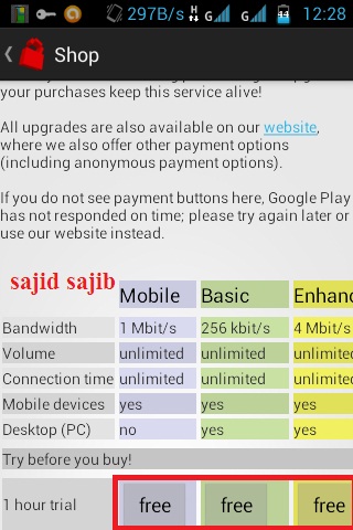 কিন্তু speed দেখলে আর চালাইতে মন চাইবো না। 😛 এখন আপনি আবার অপশন এ যান। shop ক্লিক করেন। দেখবেন ওই খানে লেখা আছে try before you buy! free তে ক্লিক করে ১ ঘণ্টা আপনি ফুল স্পিডে নেট ইউস করতে পারবেন। নিচের ছবি দেখেন।