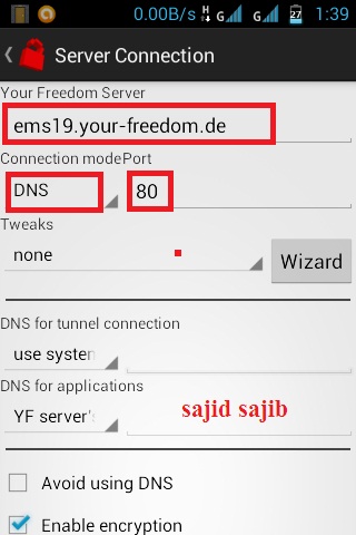 ৫) তারপর server connection এ যান। your freedom server দিন ems19.your-freedom.de, connection mode দিন DNS এবং port দিন 80. নিচের screenshot দেখুন।