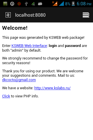 এ পর্যায়ে আপনি চাইলে আপনার সাইট ভিজিট করতে পারবেন। ওয়ার্ডপ্রেস সিএমএস সহ যে কোন সিএমএস ইন্সটল করতে পারেন। ডিভাইসে localhost:8080 ব্যাবহার করে ভিজিট করেত পারেন অথবা KSWEB এ দেখানো আইপি ব্যাবহার করে ভিজিট করতে পারেন। এ অবস্থায় আপনি শুধু আপনার লোকাল নেটওয়ার্ক থেকে ব্লাউজ করতে পারবেন।
