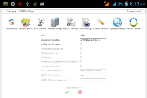 এবার KSWEB settings অপশনে ক্লিক করুন এবং MySQL shell password পাসওয়ার্ড সেট করে সেইভ করুন। KSWEB এর সেটিং মেনু থেকে Document Root অপশন ব্যাবহার করে আপনার সাইটের জন্য একটি রুট ডিরেক্টরি সেট করতে পারেন। আপনি চাইলে ডিফল্ট রুট ডিরেক্টরি (sdcard/htdocs) ব্যাবহার করতে পারেন।