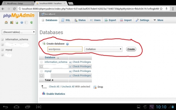 গুগল ক্রোমের এ্যাড্রেসবারে http://localhost:8080/phpmyadmin/ টাইপ করে যে কোন নামে ডা্টাবেস তৈরী করুন।(আমি wordpress নামে করেছি)