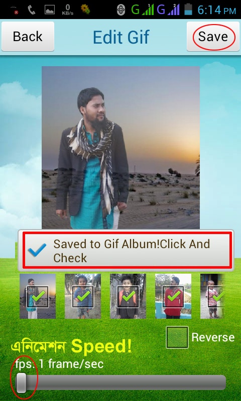 এবার Frame 1/Sec রেখে উপরের সেভ বাটনে ক্লিক করুন, তাহলে সেভ হয়ে যাবে, দেখতে হলে Gif Album বাটনে ক্লিক করুন দেখুন কেমন হয়েছে।