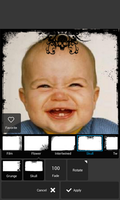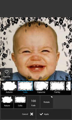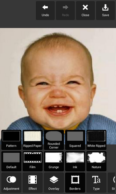 মেইন মেনু স্ক্রিনে এর পরের আইটেম হল Borders, যার মাধ্যমে আপনি Pattern, Ripped Paper, Rounded Corner, Squared, White Ripped, Default, Film, Grunge, Ink, Nature নামে মোট ১০ ধরনের বিভিন্ন বর্ডার বা ফ্রেম ছবিতে যোগ করতে পারবেন।