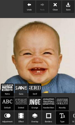 এর পরে আছে Type নামের মেইন মেনু অপশন যেখানে ট্যাপ করে আপনি মোট ৭টি ফন্ট ক্যাটাগরি থেকে শতাধিক ফন্ট ব্যবহার করতে পারবেন ও ছবির উপর লিখতে পারবেন।
