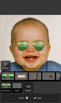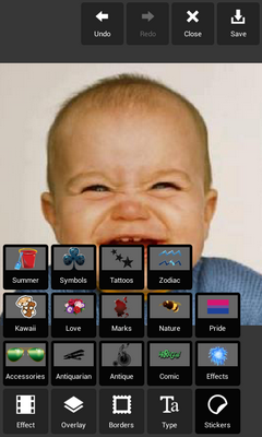 মেইন মেনুর শেষ অপশন হল স্টিকারস। এই অপশনটি ব্যবহার করে Summer, Symbols, Tattoos, Zodiac, Kawaii, Love, Marks, Nature, Pride Accessories, Antiquarian, Comic, Effects নামের ১৪টি স্টিকার ক্যাটাগরি থেকে বহু সংখ্যক স্টিকার ব্যবহার করে ছবিতে যোগ করতে পারবেন।