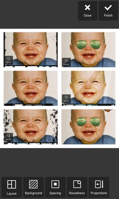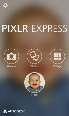 প্রথম স্ক্রিনে আছে চারটি অপশনঃ ক্যামেরা (ছবি তুলে তা এডিট করার জন্য), ফটোস (গ্যালারিতে আগের কোন ছবি এডিট করার জন্য), কোলাজ (ফটো থেকে কোলাজ করার জন্য) ও ফ্রেশ (সদ্য তোলা ছবিতে কাজ করার জন্য)।