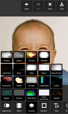 এরপরে মেইন মেনুতে আছে ওভারলে অপশন। এখান থেকে Smoke, Space, Tie Dye, Vignette, Light Paint, Neon, Olga, Paper, Retro Poster, Fireworks, Flame, Grunge, Leaking Hd, Leaks, Bokeh, Canvas, Chem Burn, Color Correction, Default নামে ১৯টি ওভারলে যোগ করার অপশন নিয়ে কাজ করতে পারবেন।