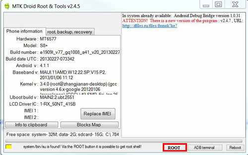 MTK Droid Tool ওপেন করে আপনার রুটেড ফোনটি USB Debugging অন অবস্থায় কানেক্ট করুন। ঠিক ভাবে কানেক্ট হলে আপনার ফোনের ডিটেইলস শো করবে। যদি আপনার ফোনটি রুট করা থাকে, তাহলে Droid Tools এর বাম পাশে নিচের কালার ইন্ডিকেটর টি হলুদ থাকবে। এই অবস্থায় Root এ ক্লিক করুন।
