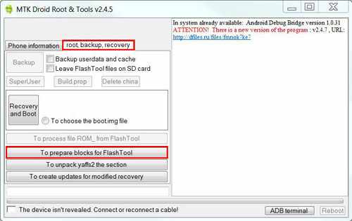 আপনার ফোন পিসিতে কানেক্ট করার দরকার নেই। প্রথমে root, backup, recovery ট্যাব এ যান, তারপর To prepare Blocks For Flashtool এ ক্লিক করুন।