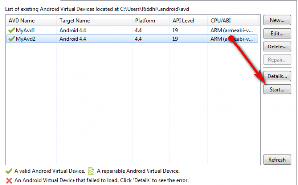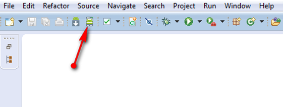 এবার অ্যাপ্লিকেশান টি রান করার জন্য Android Virtual Device বা AVD manager সিলেক্ট করতে হবে , নিচের ছবির মতন অপশন এ ক্লিক করুন