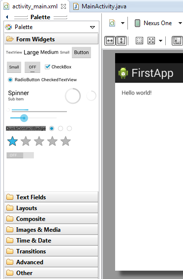 তারপর activity_main.xml ফাইলটি ওপেন করে TextView তে android:text="@string/FirstText" কোডটি লিখে দিলে আর এরর প্রদর্শন করবে না। এভাবে টেক্সট সঙ্কেত দূর করা যায়।