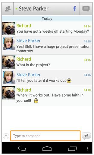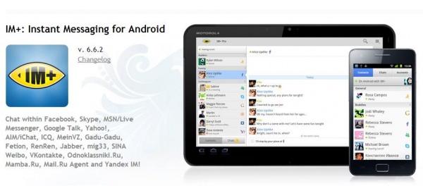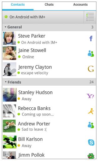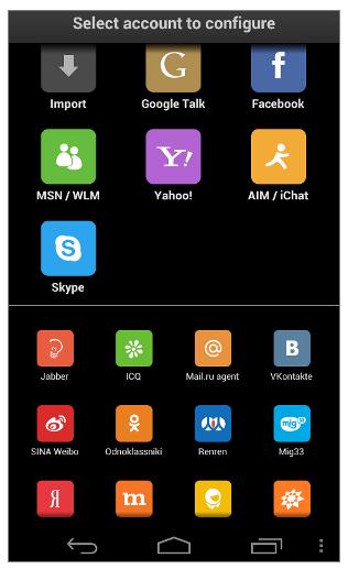 Facebook, Skype, MSN/Live Messenger, Google Talk, Yahoo!, AIM/iChat, ICQ, MeinVZ, Gadu-Gadu, Fetion, RenRen, Jabber, mig33, SINA Weibo, VKontakte, Odnoklassniki.Ru, Mamba.Ru, Mail.Ru Agent andYandex IM!