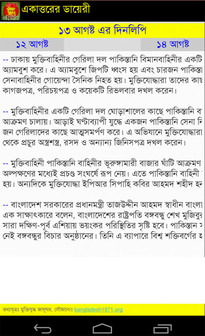 মহান মুক্তিযুদ্ধের প্রতিদিনের বিশেষ ঘটনাবলী নিয়ে একটি এন্ড্রয়েড এপ্লিকেশন "একাত্তরের ডায়েরী"।