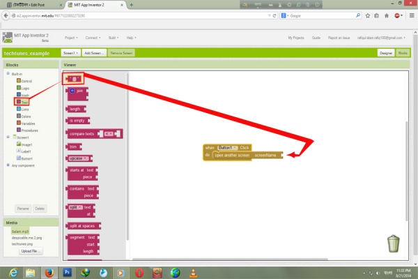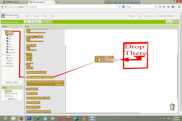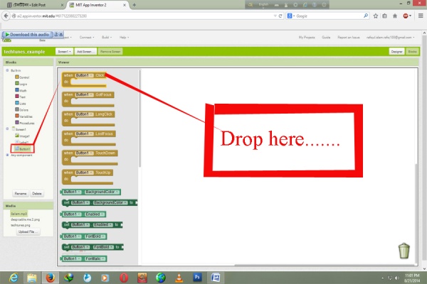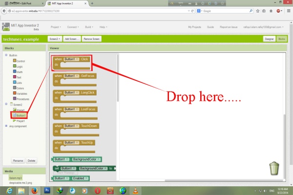 প্রথমে আমরা ট্যাব থেকে Button1 এ ক্লিক করব । ওইখান থেকে সবার উপরের টা "When button1 click do" টা এনে সাদা খালি জায়গায় ছেরে দিব।