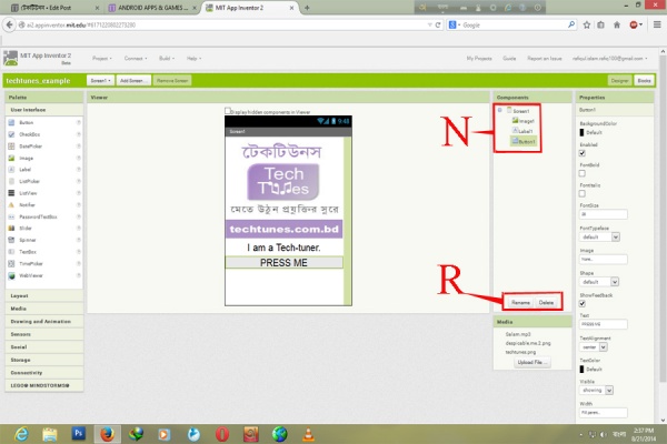 ♦ 5 চিনহিত বক্সটি হল আমরা যা যা এই অ্যাপটিতে দিব, যেমনঃ- টেকটিউনস এর ছবি, একটা অডিও আম্পি ৩, আর একটা ছবি। আর কিছু যোগ করতে হলে আপলোড বাটনে ক্লিক করুন। (আমি আগেই আপলোড করে রেখেছি ফাইলগুলি)